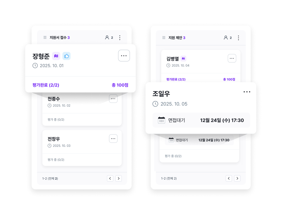 지원자를 한 눈에 파악할 수 있는 칸반보드로 표시돼요. AI매칭된 지원자와 직무적합도가 높은 지원자를 한 눈에 알 수 있어요.