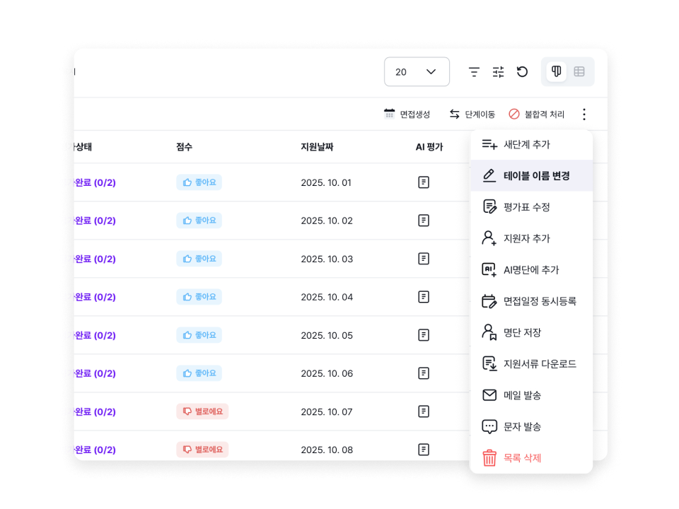 평가상태와 평가점수를 확인하기도 쉽고, 평가를 통해 지원자 상태를 변경하는 방법도 매우 쉽죠.